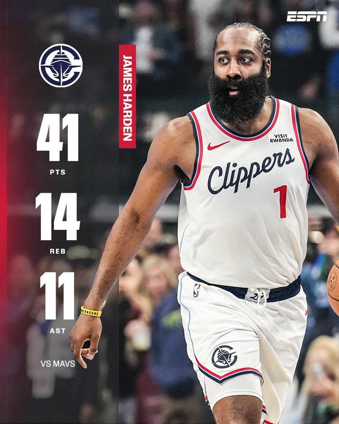 詹姆斯·哈登对阵独行侠砍下40分三双,创造快船队历史
